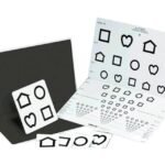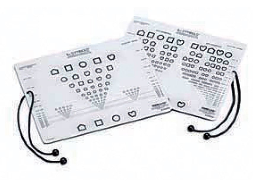This test measures near visual acuity with proportionally spaced (logMAR) lines on the front and lines with 25% and 50% spacing on the back. Response key printed on test card. Includes training cards and instructions. Card measures: 20.3 x 25.4 cm (8 x 10″).