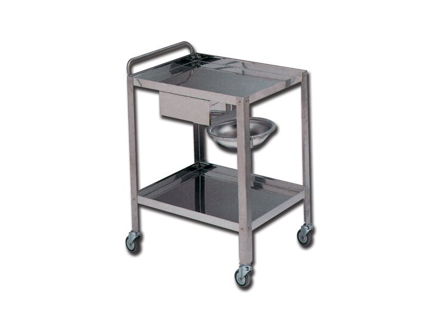 Dressing trolley made of AISI 304 stainless steel with 2 shelves (70 x 50 cm), 1 drawer (40 x 50 x h 15 cm), basin holder and basin.
