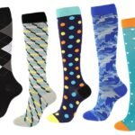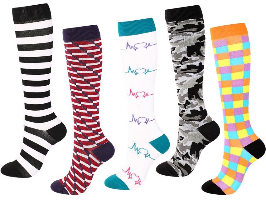 Colourful knee-high socks with graduated compression to improve blood circulation.